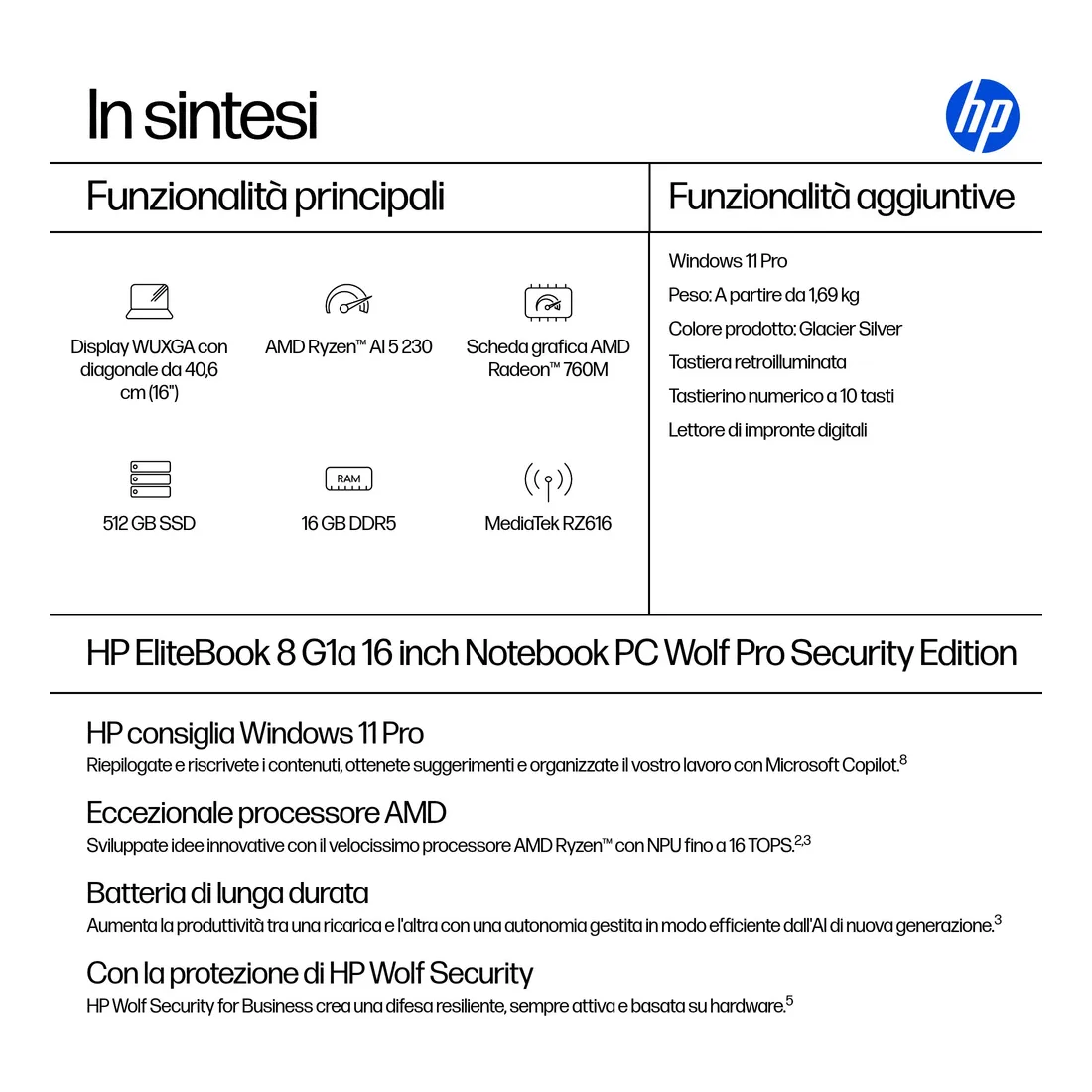 HP EliteBook 8 G1a Wolf Pro Security Edition. Tipo di prodotto: Computer portatile, Fattore di forma: Clamshell. Famiglia processore: AMD Ryzen AI 5, Modello del processore: 230, Frequenza del processore: 4,9 GHz. Dimensioni diagonale schermo: 40,6 cm (16″), Tipologia HD: WUXGA, Risoluzione del display: 1920 x 1200 Pixel. Memoria Interna: 16 GB, Tipo di RAM: DDR5-SDRAM. Capacità totale di archiviazione: 512 GB, Supporto di memoria: SSD. Modello scheda grafica integrata: AMD Radeon 760M. Sistema operativo incluso: Windows 11 Pro. Colore del prodotto: Argento