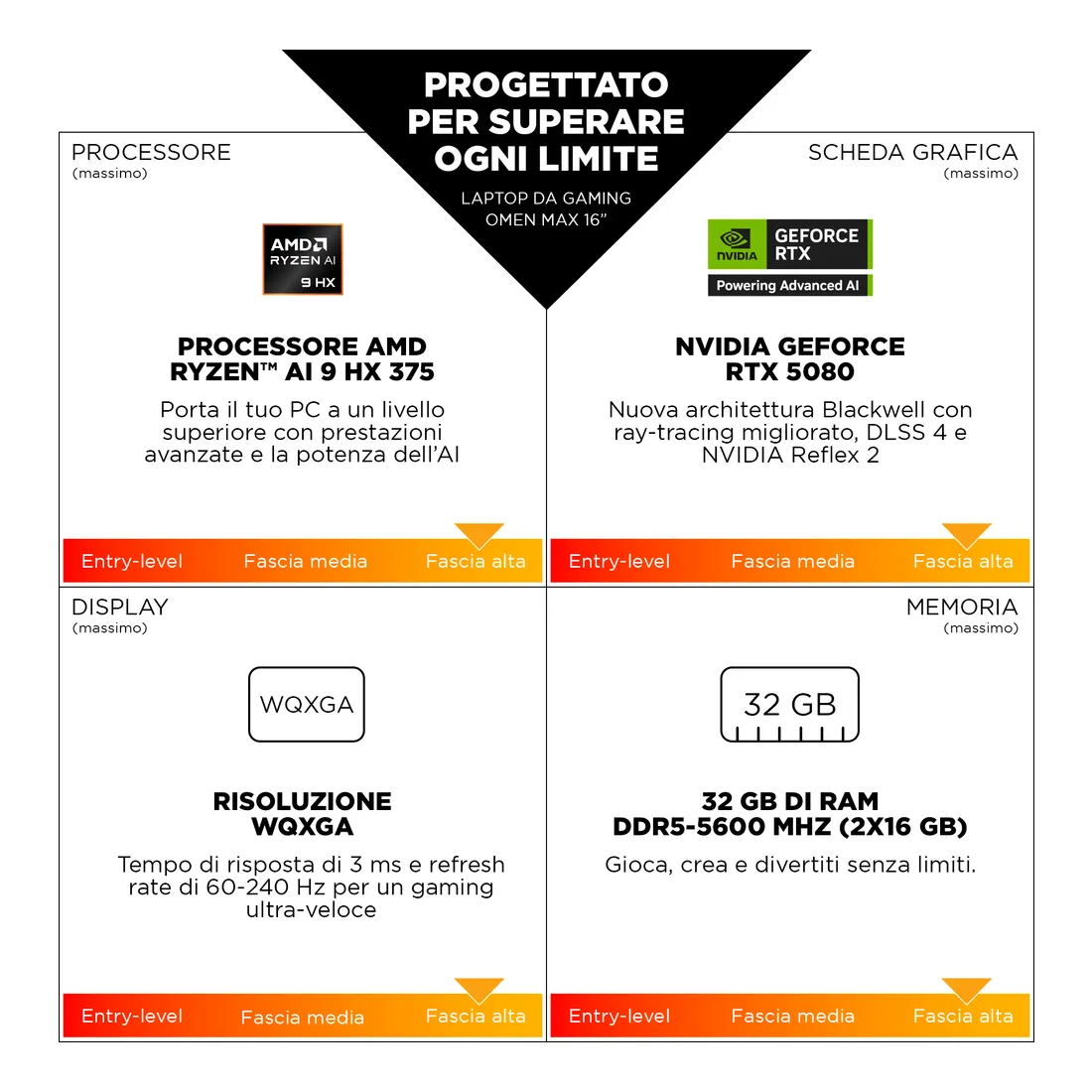HP OMEN MAX Gaming Laptop 16-ak0005nl. Tipo di prodotto: Computer portatile, Fattore di forma: Clamshell. Famiglia processore: AMD Ryzen AI 9, Modello del processore: 375. Dimensioni diagonale schermo: 40,6 cm (16″), Tipologia HD: WQXGA, Risoluzione del display: 2560 x 1600 Pixel. Memoria Interna: 32 GB, Tipo di RAM: DDR5-SDRAM. Scheda grafica dedicata: NVIDIA GeForce RTX 5080. Sistema operativo incluso: FreeDOS. Colore del prodotto: Nero. Peso: 2,71 kg