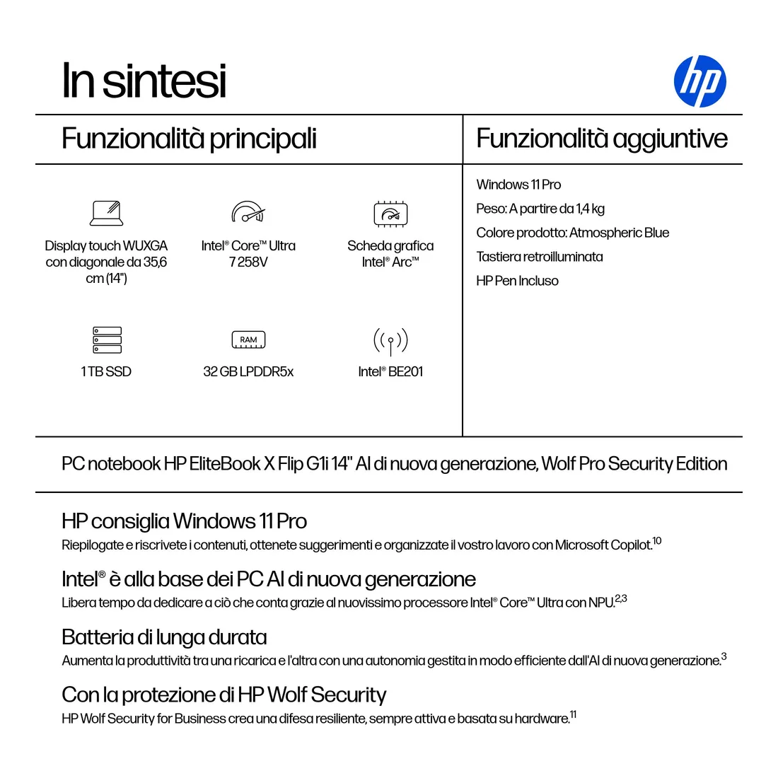 HP EliteBook X Flip G1i Next Gen AI Wolf Pro Security Edition. Tipo di prodotto: Ibrido (2 in 1), Fattore di forma: Convertibile (a cartella). Famiglia processore: Intel Core Ultra 7, Modello del processore: 258V. Dimensioni diagonale schermo: 35,6 cm (14″), Tipologia HD: WUXGA, Risoluzione del display: 1920 x 1200 Pixel, Touch screen. Memoria Interna: 32 GB, Tipo di RAM: LPDDR5x-SDRAM. Capacità totale di archiviazione: 1 TB, Supporto di memoria: SSD. Modello scheda grafica integrata: Intel Arc Graphics. Sistema operativo incluso: Windows 11 Pro. Colore del prodotto: Blu