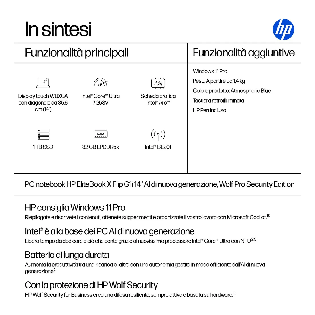 PC notebook HP EliteBook X Flip G1i 14” AI di nuova generazione, Wolf Pro Security Edition, 14″, Schermo touch, Windows 11 Pro, Intel Core™ Ultra 7, 32GB RAM, 1TB SSD, WUXGA, Atmospheric Blue, Copilot+ PC