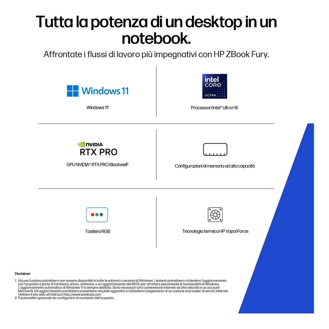 HP ZBook Fury G1i Wolf Pro Security Edition. Tipo di prodotto: Workstation mobile, Fattore di forma: Clamshell. Famiglia processore: Intel Core Ultra 7, Modello del processore: 255HX. Dimensioni diagonale schermo: 40,6 cm (16″), Tipologia HD: 2.5K, Risoluzione del display: 2560 x 1600 Pixel. Memoria Interna: 32 GB, Tipo di RAM: DDR5-SDRAM. Capacità totale di archiviazione: 1 TB, Supporto di memoria: SSD. Modello scheda grafica integrata: Intel Graphics, Scheda grafica dedicata: NVIDIA RTX PRO 3000 Blackwell. Sistema operativo incluso: Windows 11 Pro. Colore del prodotto: Argento