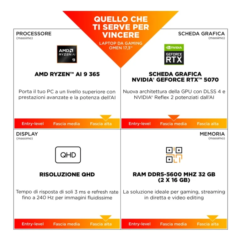 HP OMEN Gaming 17-db1003nl Copilot+ PC AMD Ryzen AI 9 365 Computer portatile 43,9 cm (17.3″) Quad HD 32 GB DDR5-SDRAM 1 TB SSD NVIDIA GeForce RTX 5070 Wi-Fi 6 (802.11ax) Windows 11 Home Nero