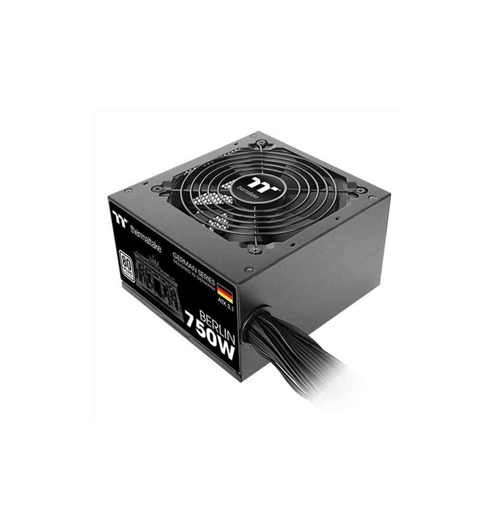 Thermaltake HAMBURG. Potenza totale: 750 W, Tensione di ingresso AC: 200 - 240 V, Potenza di picco: 750 W. Connettore scheda madre: 24-pin ATX, Lunghezza del cavo di alimentazione della scheda madre: 60 cm, Lunghezza del cavo di alimentazione SATA: 500,650,800,950 mm. Utilizzo: PC, Fattore di forma dell'unità di alimentazione (PSU): ATX, Certificazione 80 PLUS: 80 PLUS. Colore del prodotto: Nero, Tipo di raffreddamento: Attivo, Diametro del ventilatore: 12 cm. Certificati di conformità: CB, CE, Direttiva sulla bassa tensione (LVD), RCM, UKCA