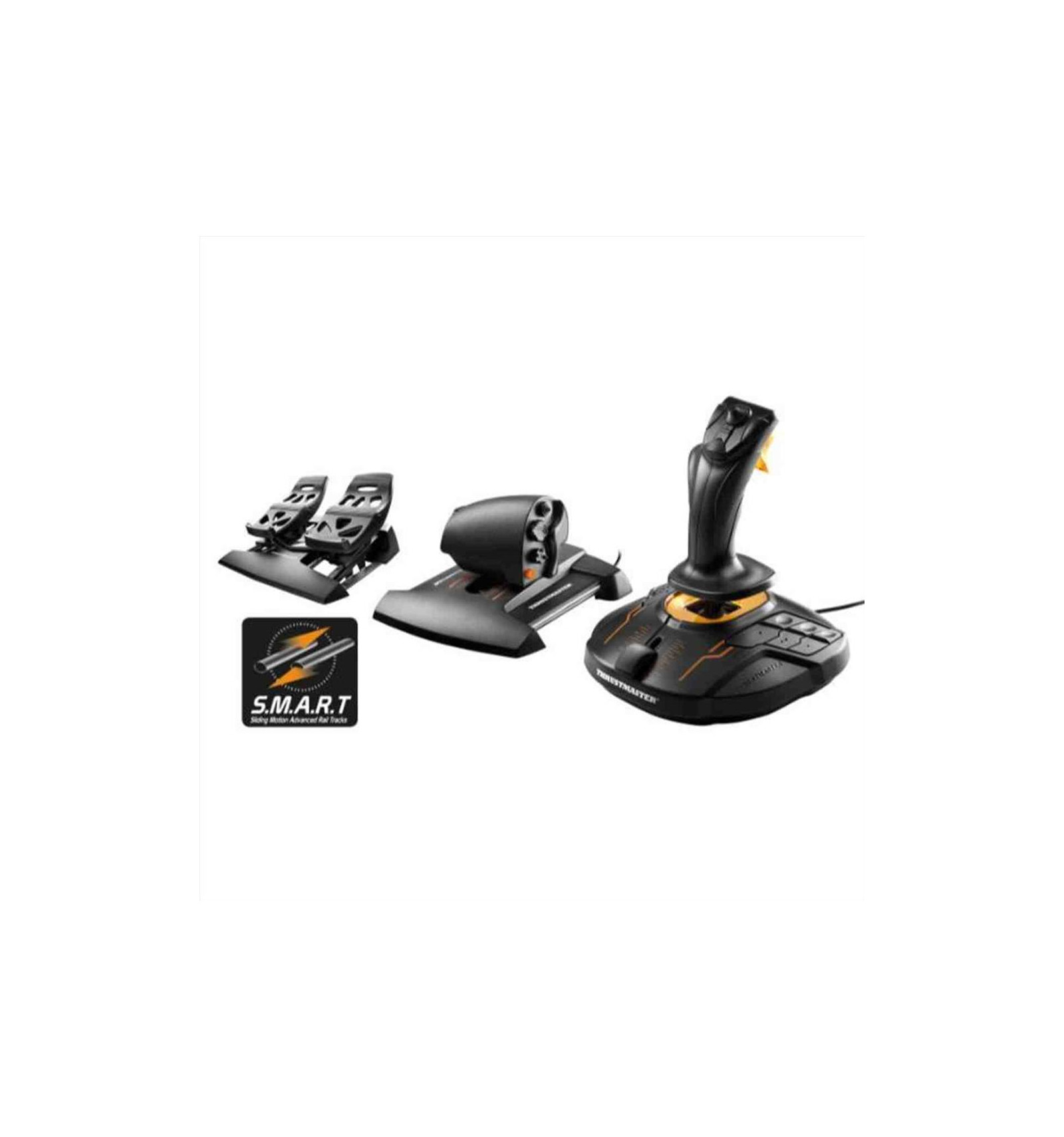 Joystick di volo T.16000M FCS (Flight Control System) con tecnologia magnetica di precisione H.E.A.R.T + manetta TWCS (Thrustmaster Weapon Control System) + TFRP (Thrustmaster Flight Rudder Pedals), entrambi dotati di tecnologia S.M.A.R.T. Intuitivo e naturale: sarà proprio come sedersi nell'abitacolo!