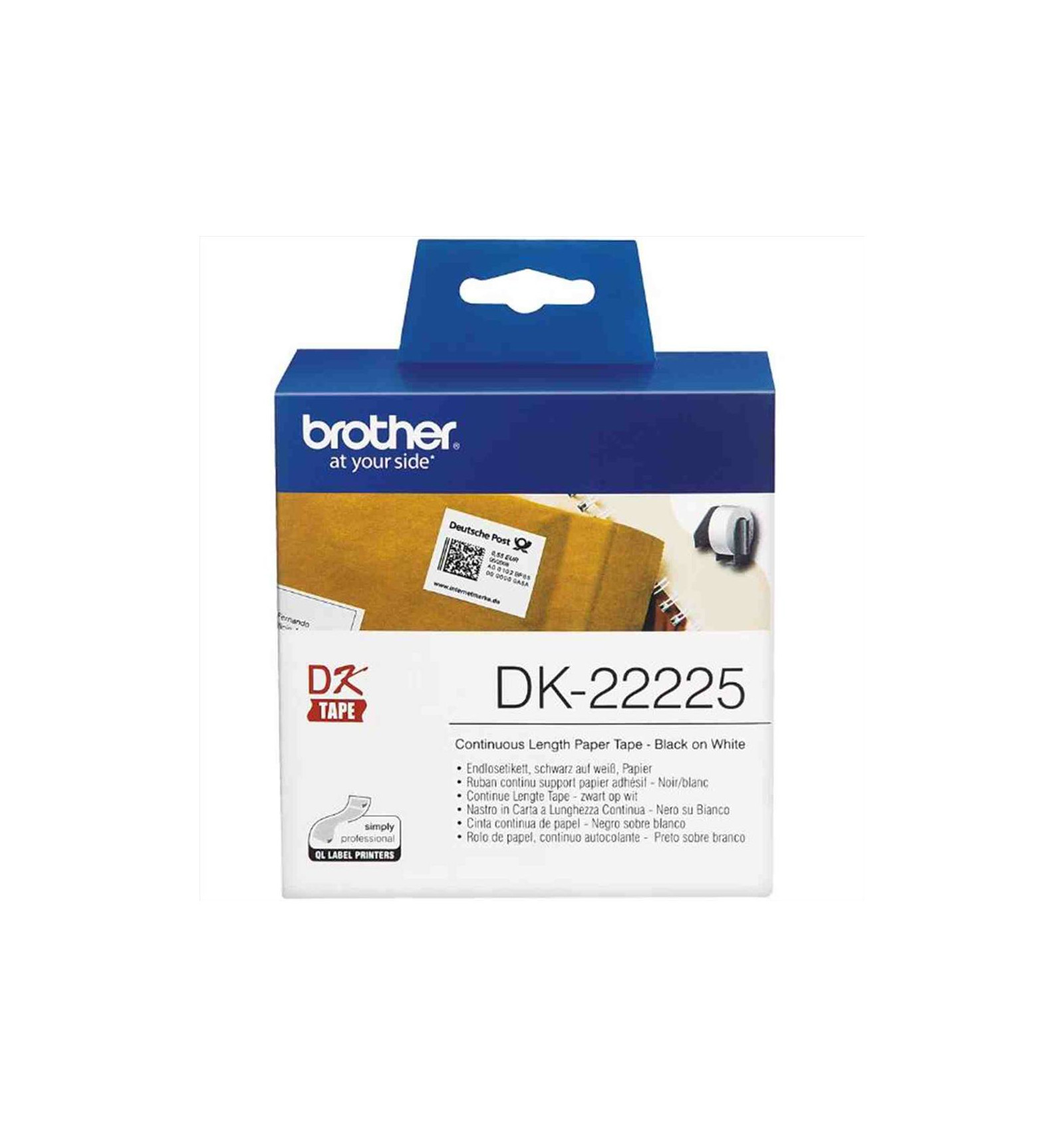 Il rotolo di etichette di carta a lunghezza continua nero su bianco Brother DK-22225 – 38 mm. Il nastro è lungo 30,48 m.