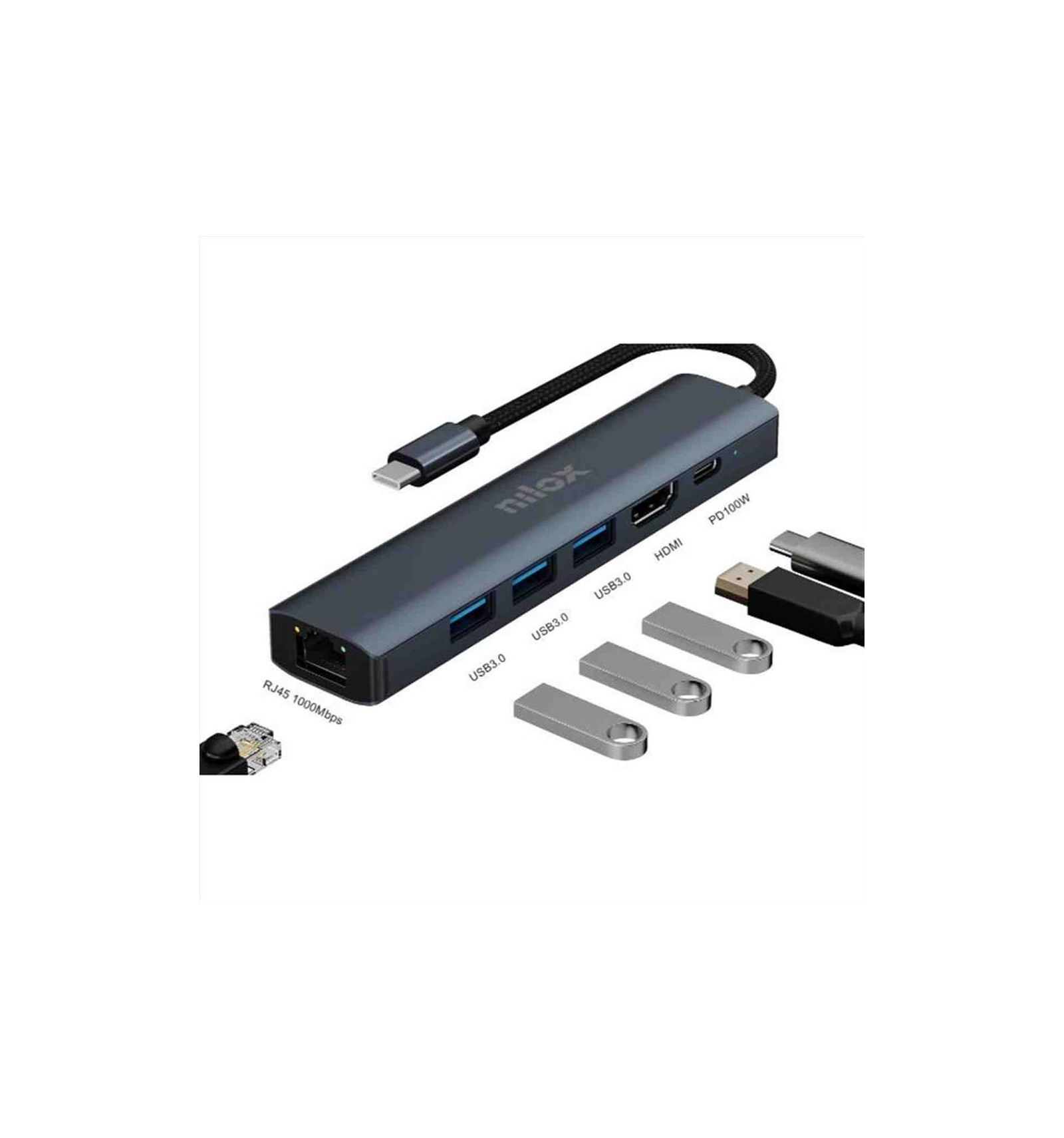 NXDSUSBC06 è un adattatore USB Type-C 6 in 1, include un'uscita HDMI che supporta risoluzioni fino a 4K/30Hz, 3 porte USB 3.0 con velocità fino a 5 Gbps, 1 porta Gigabit Ethernet fino a 1000 Mbps e una porta USB Type-C Porta -C (erogazione di potenza) fino a 100 W.
