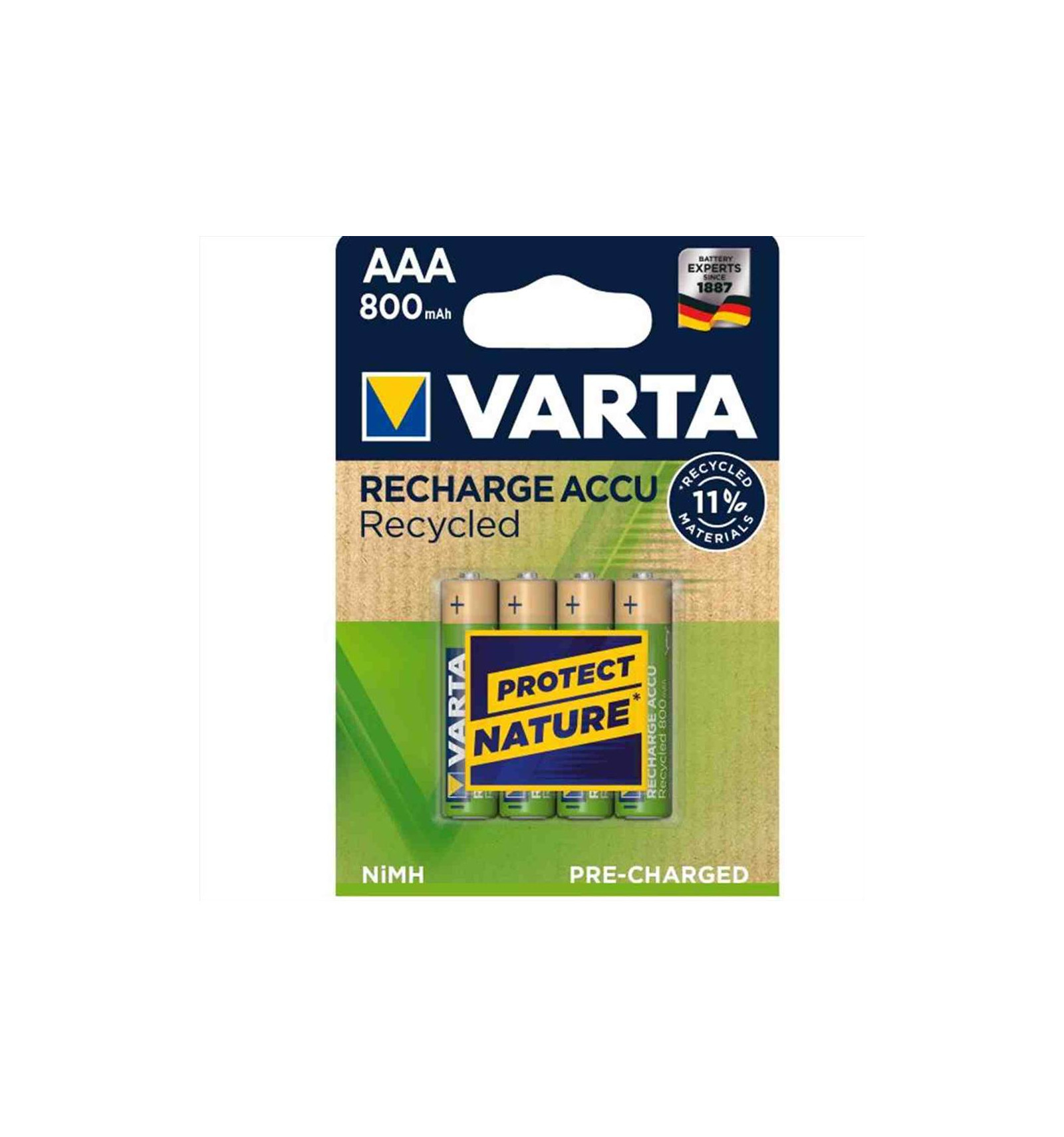 Varta RECYCLED Batteria Ricaricabile AAA Ministilo, 800 mAh, Confezione da 4 Pile, Pre-caricate, Pronte all'Uso