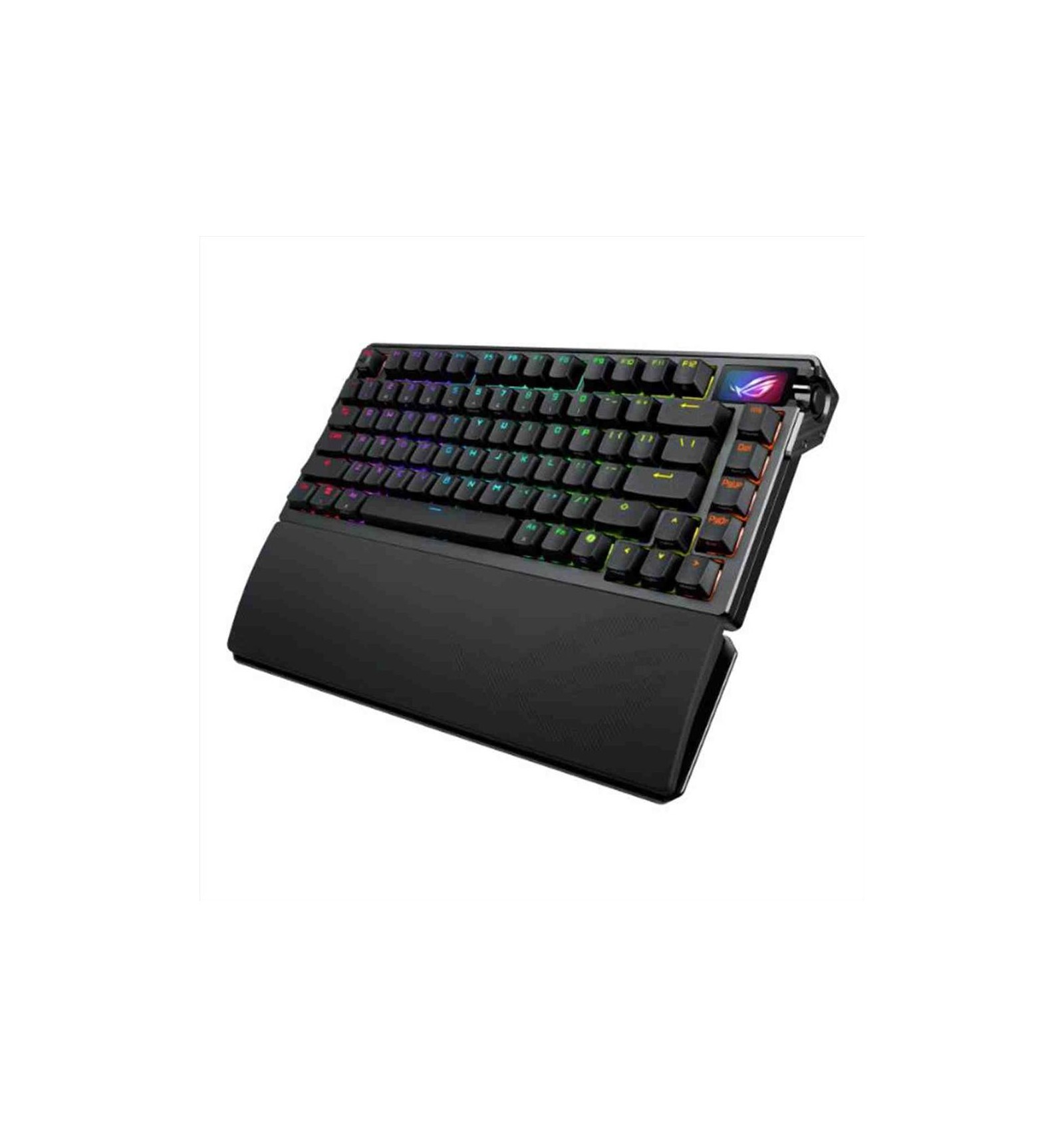 ROG Azoth Extreme è una tastiera gaming personalizzabile al 75% con telaio in lega di alluminio e struttura in metallo. È dotata di una frequenza di trasmissione di 8000 Hz con ROG Polling Rate Booster e di oltre 1600 ore di durata della batteria in modalità wireless ROG SpeedNova a 2,4 GHz. Il touchscreen OLED aggiornato e la manopola a tre vie consentono di monitorare il sistema e di effettuare regolazioni rapide. La piastra di posizionamento in fibra di carbonio garantisce una digitazione nitida, mentre tre strati di smorzamento assorbono le vibrazioni. Un supporto a guarnizione regolabile con interruttore a paletta offre due preferenze di digitazione.
